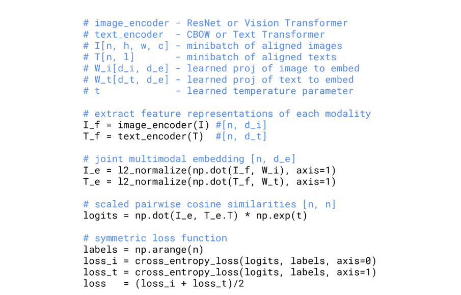 对于每一个batch,其有N个(图像,文本)对,可以组成NxN个(图像,文本)对,N个正样本,其余的都为负样本,这NxN个图像文本对的余弦相似度。训练的目标为:最大化正样本对的余弦相似度,最小化负样本对的余弦相似度
