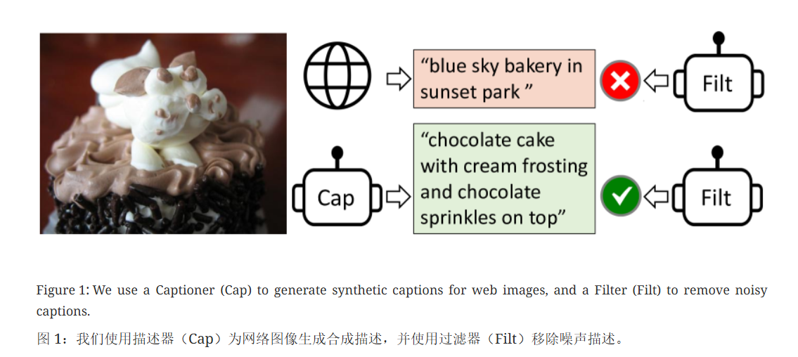 - 使用Captioner 对网络上爬取的带噪声的数据生成对应的描述(将爬取的图片,使用Captioner生成描述),模型生成的数据质量有好有坏,因此再将生成的数据使用Filter进行过滤