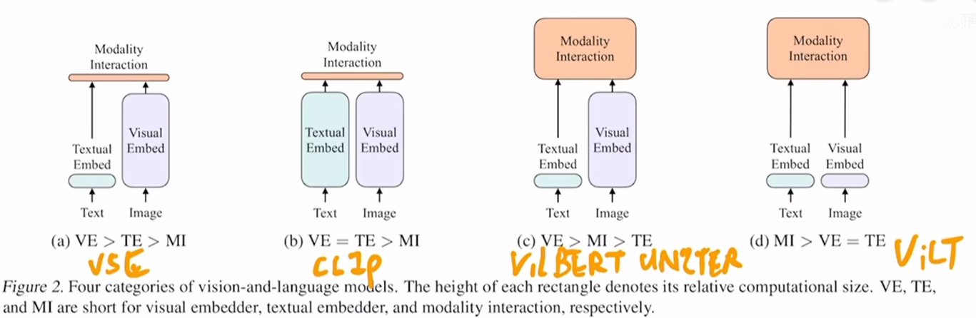 - 对于ViLT来说,其文本和视觉特征的提取都比较简单,多模态融合使用了大的模型,因此其速度相比c中的模型会更快,但是同样准确率也更低