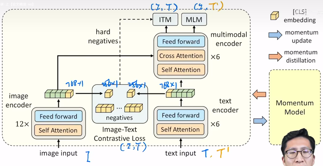 - 对于Image-Text Match 任务来说,这个任务比较简单,只需要判断给定的文本是否能描述对应的图片,而训练的时候batch_size=512,则正样本有512个,而负样本则有512*511个,这会导致负样本太多,从而导致训练的时候loss很快就下降了,因此作者提出了hard negatives,即选最难的那个负样本去计算ITM loss