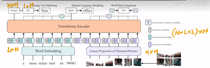 - 最后loss 的则是Image text Matching loss (只使用第一个token,即CLS token对应的向量) + masked Language Modeling loss (使用[MASK] token 对应的向量来预测,和bert 一样) + Word Patch Alignmen loss (计算每个token和每个图像patch之间的相似度,得到一个相似度矩阵,WPA Loss被定义为这两个嵌入序列分布之间的Wasserstein距离,WPA loss的目标则是最小化这个距离)