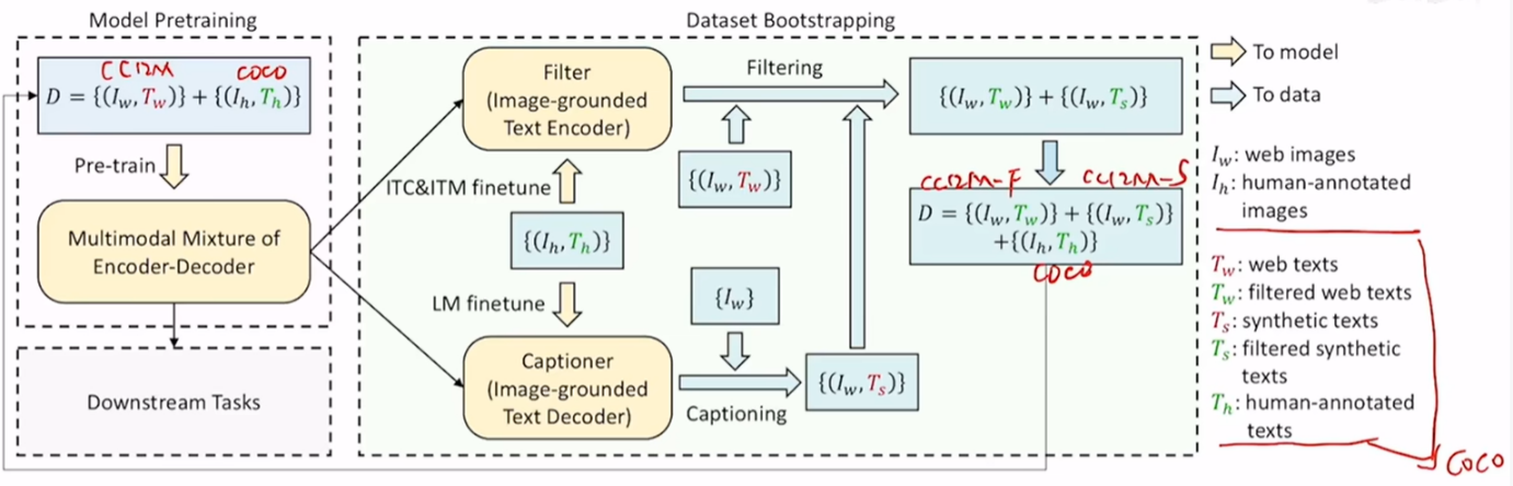 - 先使用网络爬取的带噪声的数据集(cc12 million) 和 已经人工标注的数据集(coco)预训练一个BLIP