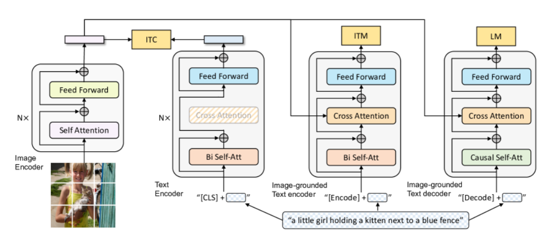 如果只看左边3部分的话,非常地像ALBEF,为了能做文本生成的任务,作者加入了一个decoder,并且把MLM loss 换成了LM loss(GPT类模型的loss,预测下一个词)