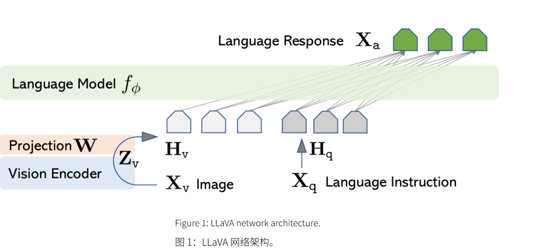 LLaVA的网络架构很简单,使用了CLIP的image encoder(ViT-L/14),使用了一个投影层将图像的输出的维度对齐word embedding 的维度,最后将二者concat起来,输入到LM(Vicuna)中,最后模型预测下一个词