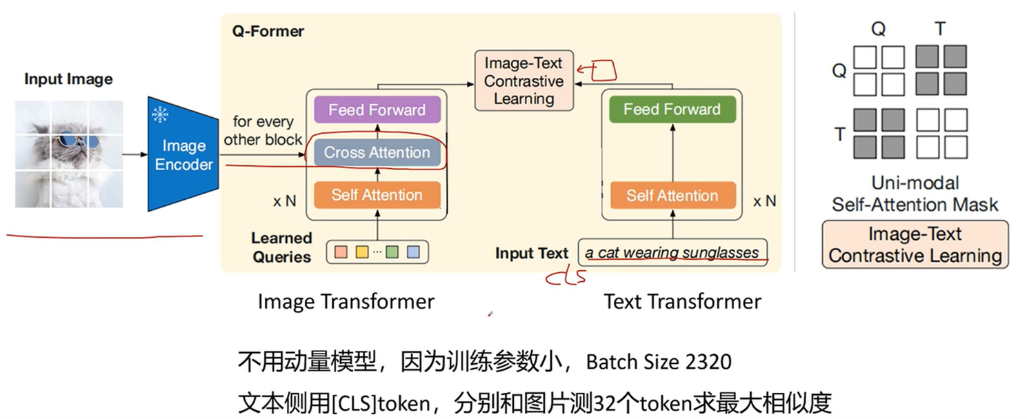 对于一个图像-文本对,image transformer 的输出为32x768 ,而text transformer 的输出为768,求出文本和32个token的相似度,选择相似度最高的作为该图像-文本对的相似度。