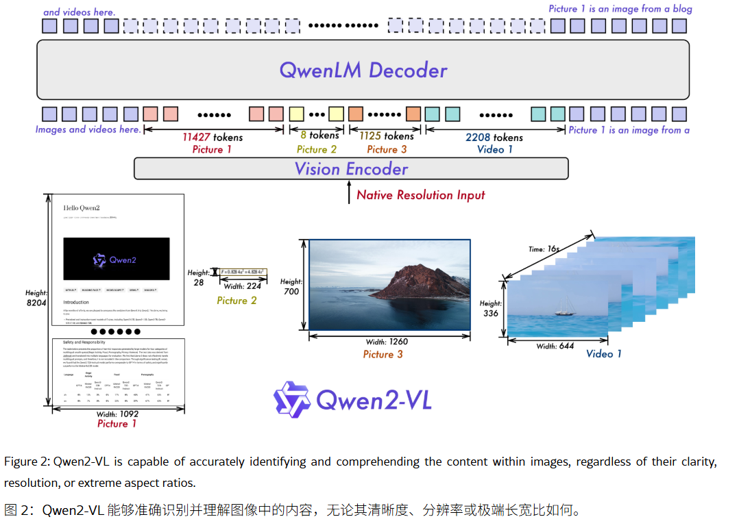 - 采用了M-RoPE(多模态旋转位置编码) 来对文本、图像、视频进行位置编码