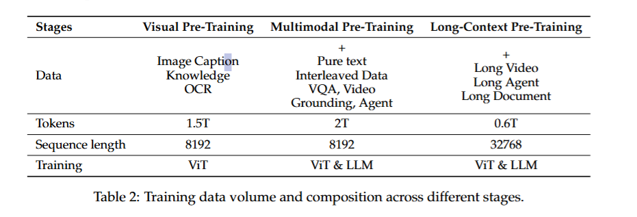 - 第三阶段: 为了提升模型对长视频、长文档、和agent的推理能力,同时增加了模型的上下文的长度,在2的基础上引入了长视频数据、长文档、长agent数据