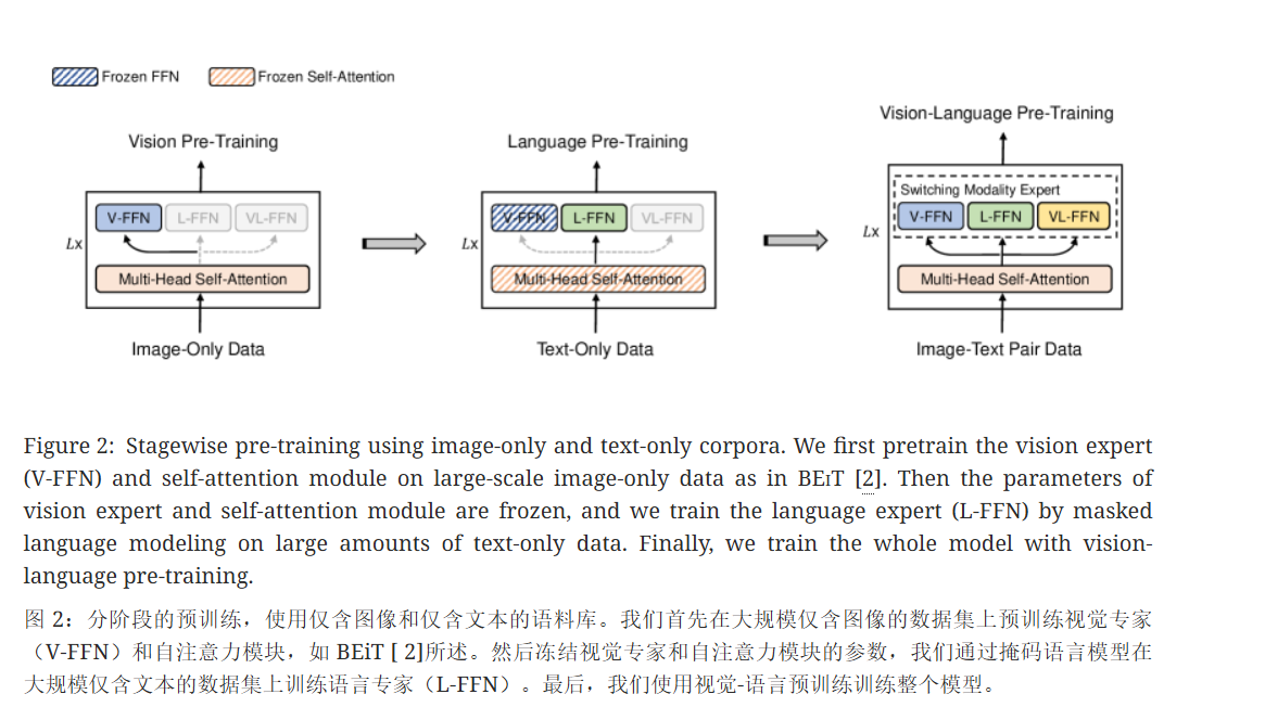 这里可以看到VLMo是先使用图像数据训练V-FFN和attention层,再使用文本数据训练L-FFN层(冻住attention层),那么倒过来是否可以