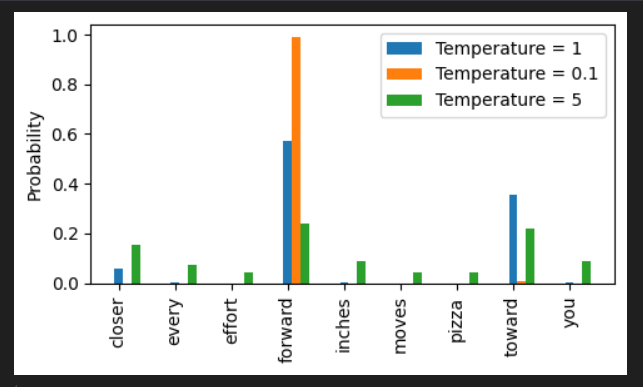 下图展示了不同温度情况下,各个token采样的次数,很明显可以看出,当temperature < 1时,最终的概率分布比较尖锐,即模型的输出比较固定,适合一些回答一些数学问题;当temperature > 1时,最终的概率分布比较平均,各个token被选中的概率会更加地平均,适合一些需要创造力的一些问题(例如写作等)